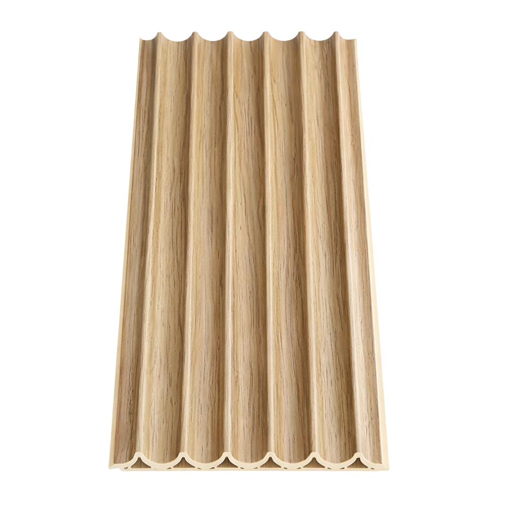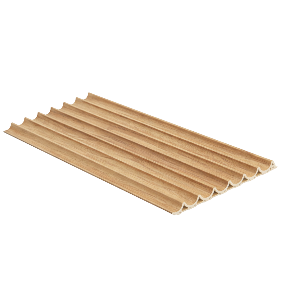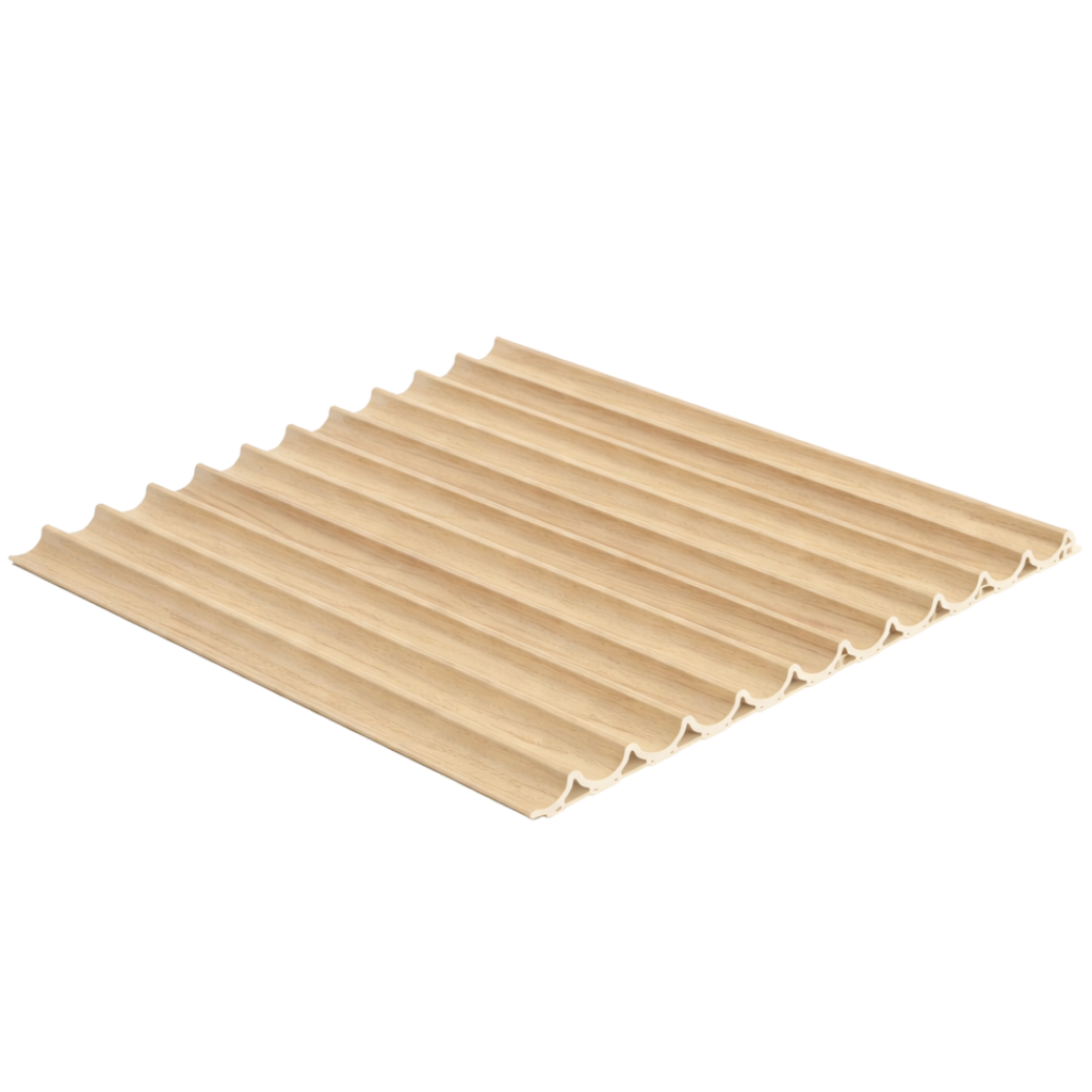Lambrín WPC para interior con acabado tipo arco (Wave) que crea ritmo y textura en muros y plafones. Ideal para proyectos arquitectónicos que buscan dinamismo visual y un acabado moderno.